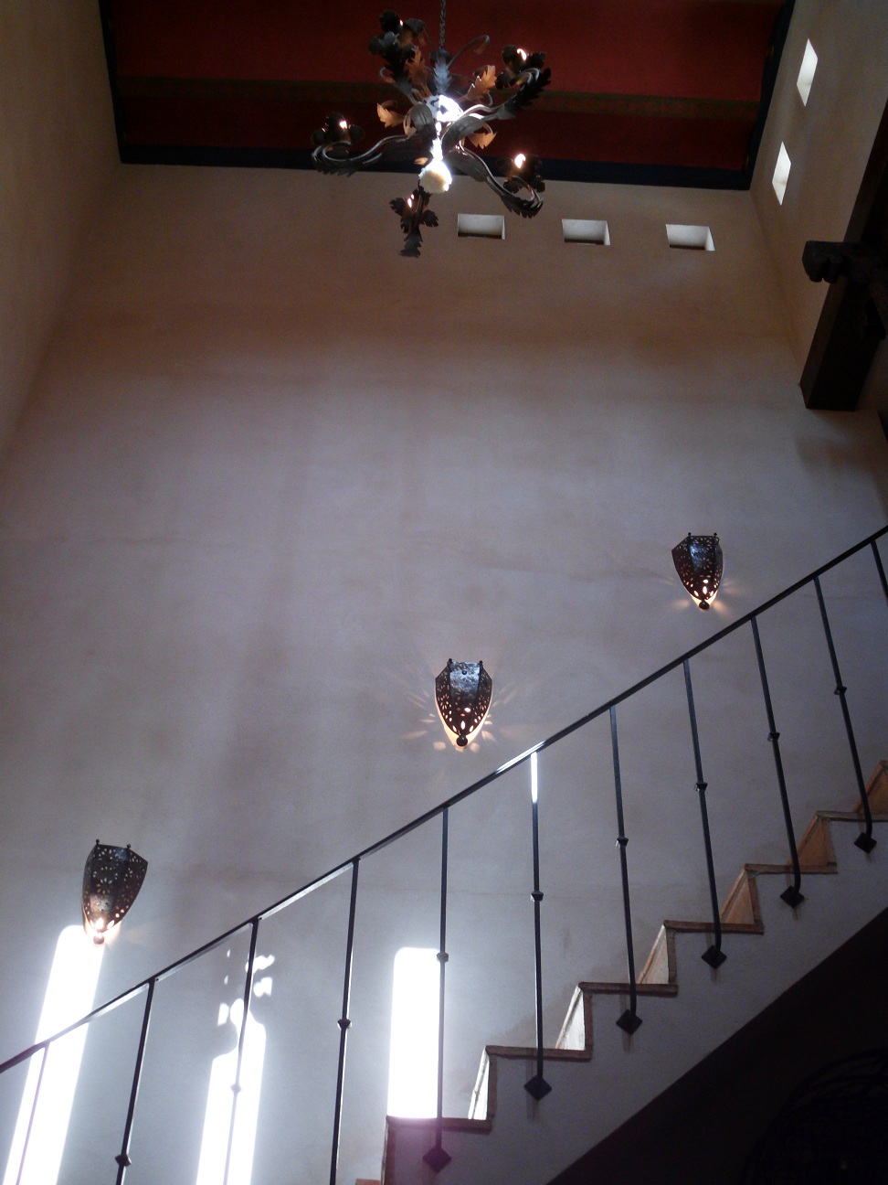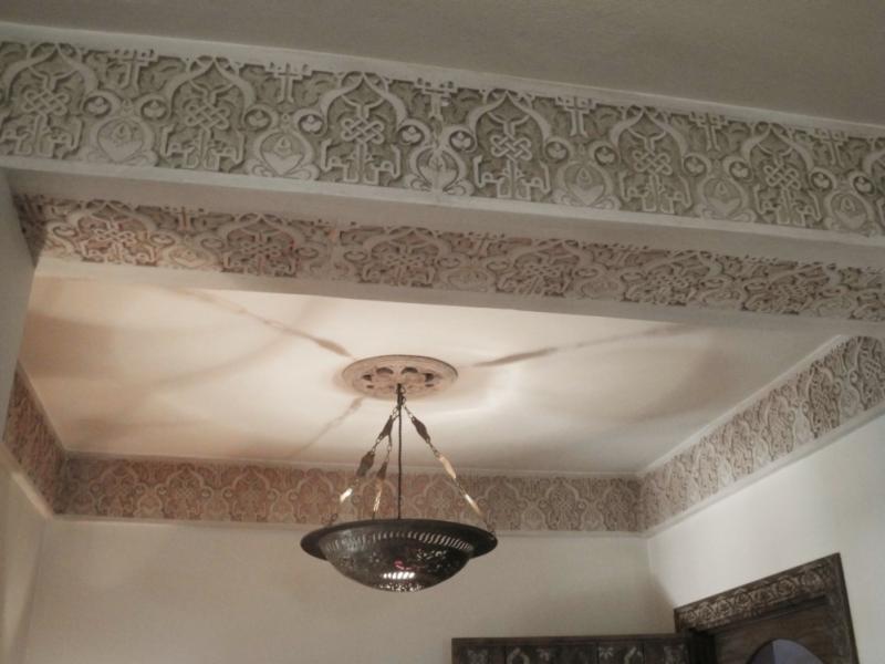 The villa is designed in an L shape, with a corner tower which has 8 metre high ceilings. The decoration of the tower ceilings, most of the interior doors and the zellige mosaic surrounding the pool were done by hand, by a team of Moroccan artisans brought to Spain to complete the project. The villa also features antique African pillars on the upstairs landing, 2 sets of 19th century Andalusian doors, Indonesian pillars into the study, hand carved shutters throughout and carreaux de ciment tiles in the bathrooms. The floors are of hand cut, Roman style terracotta, each tile being individually triple waxed to lend them the gravitas of age. All of the French doors are double glazed and made of wood. The house has gas central heating with concealed radiators and individual electric air-conditioning/heating units in rooms that get the afternoon sun.