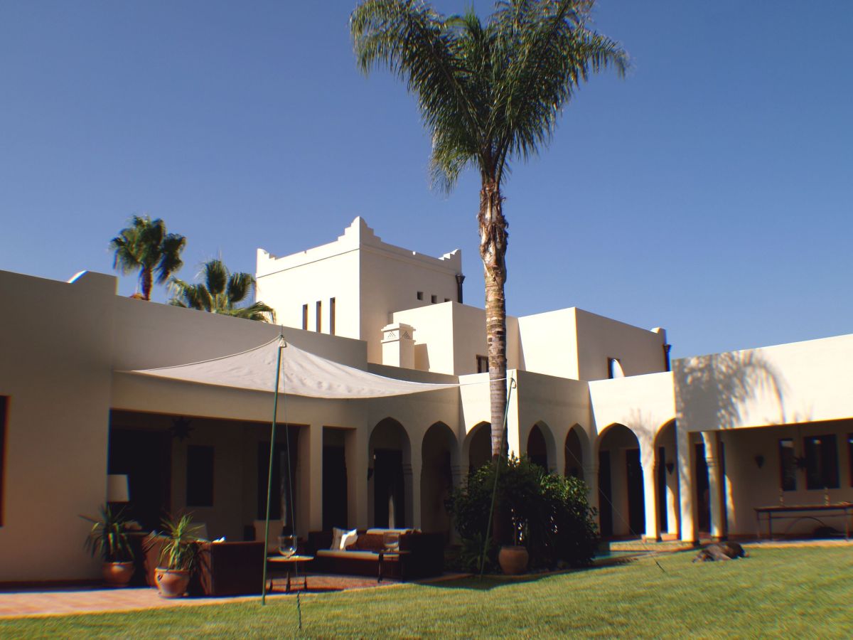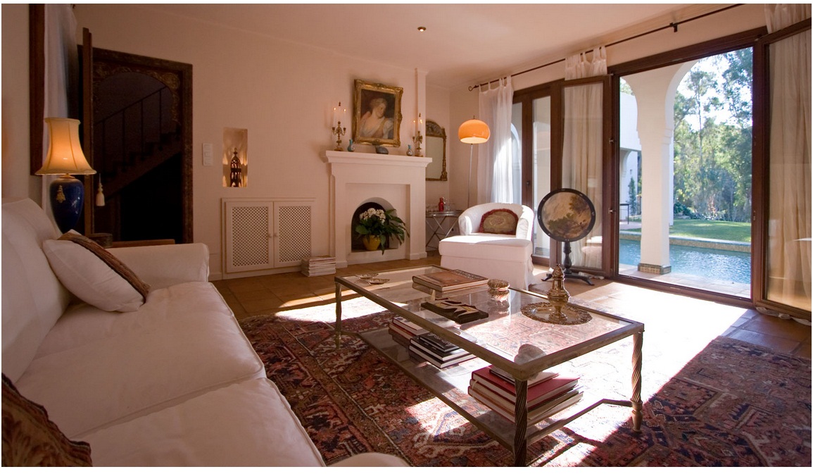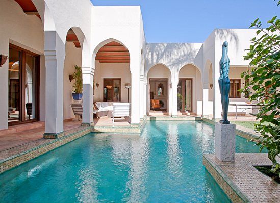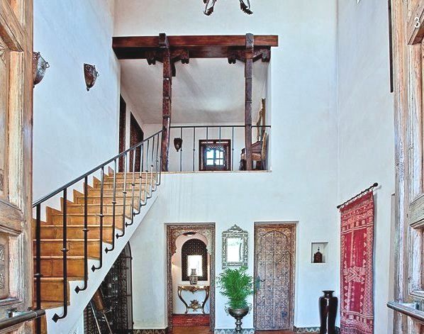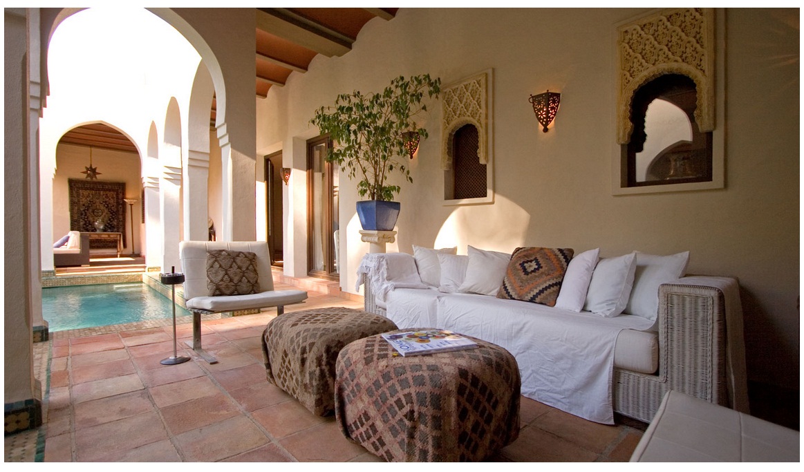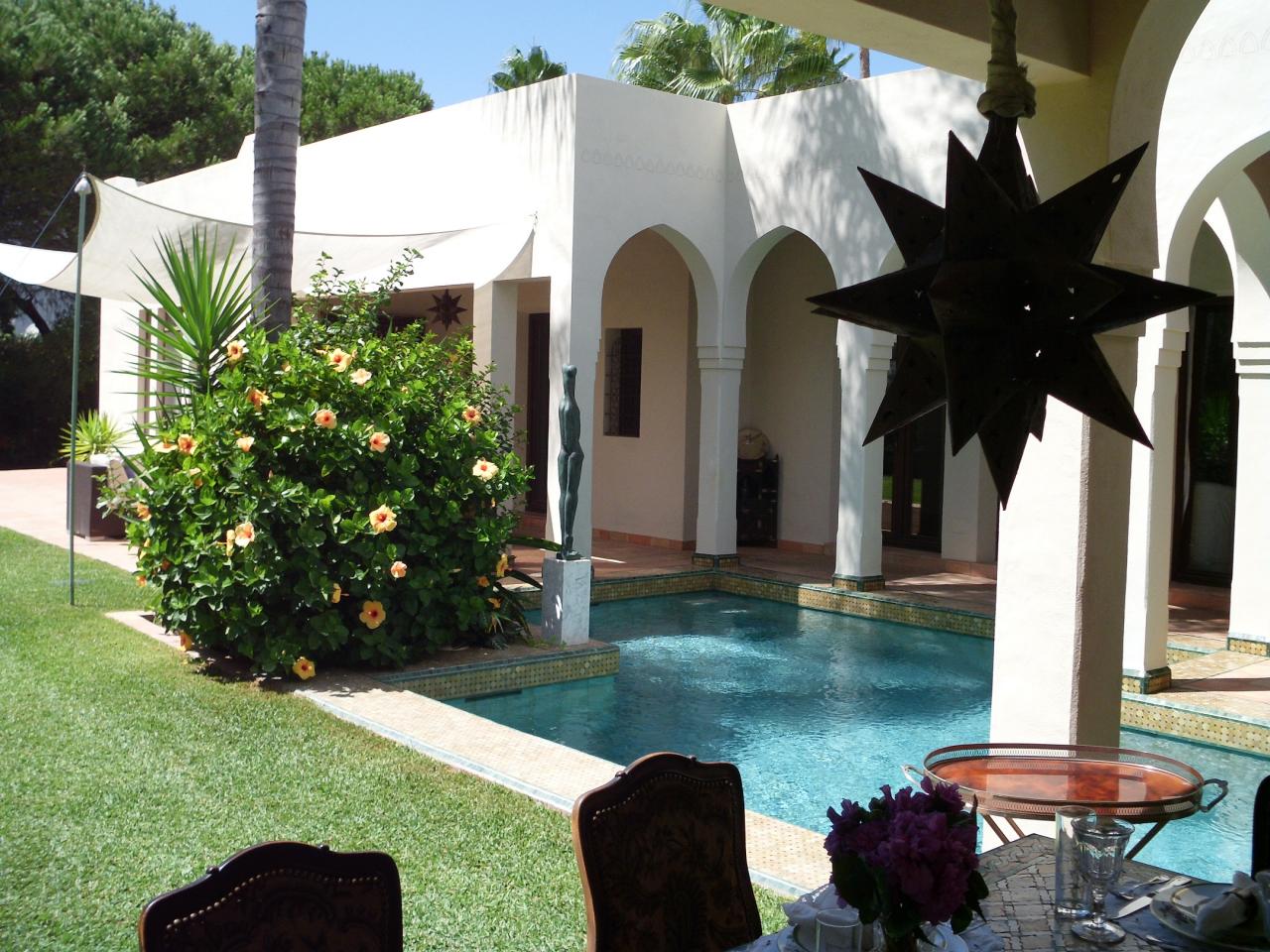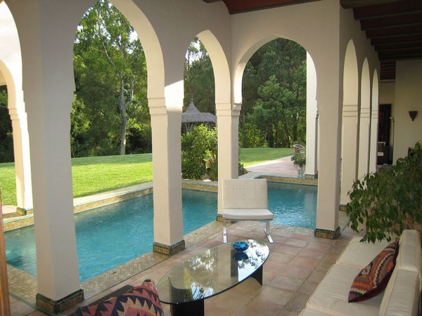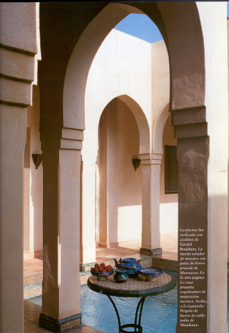 Tous les espaces de vie ont de grandes baies vitrées qui s'ouvrent sur la piscine. Beaucoup de détails ont été réalisées par des artisans marocains. Cela comprend la décoration des portes, moulures et la mosaïque qui entoure la piscine. La maison dispose également de divers antiquités incorporé dans l'architecture. Portes Espagnoles anciennes, piliers africains et indonésiens, carreaux de ciment dans les salles de bains...